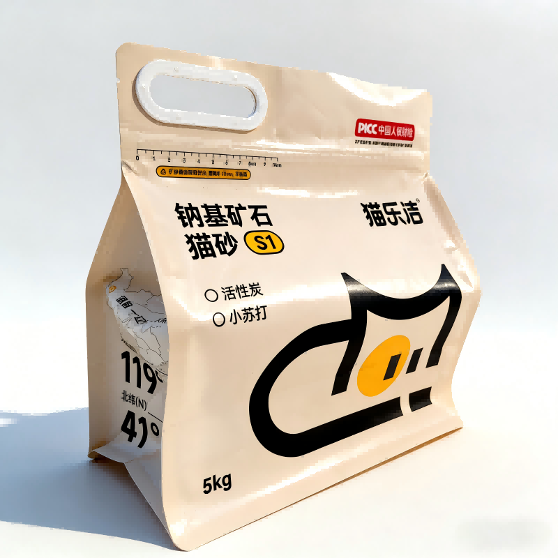 Struktur sealing wolung sisi njaga tas tetep stabil lan tegak, becik kanggo tampilan rak sing penting. Iku uga nggampangake stacking stabil lan panyimpenan trep. Gagang zipper nyedhiyakake segel sing aman lan dipercaya, nyegah kelembapan lan bledug mlebu sanajan mbukak lan nutup bola-bali. Salajengipun, desain gagang plastik sing dikuatake ngidini gampang nangani 5kg sampah kucing, nambah pengalaman pangguna.